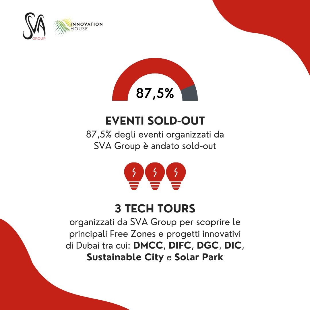 Da ottobre 2021 ad aprile 2022, in concomitanza con Expo 2020 Dubai, SVA Group ha partecipato a Innovation House, l‘iniziativa di Fondazione Politecnico di Milano e Regione Lombardia per il rilancio delle eccellenze Made In Italy all’estero. Un’occasione unica per promuovere e sviluppare l’imprenditoria italiana attraverso networking mirati con un pubblico internazionale interessato alle eccellenze del Made in Italy.