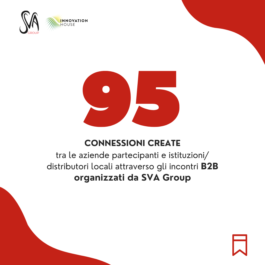 SVA Group, in qualità di partner di Innovation House, è stata incaricata dell’organizzazione di eventi con l’obiettivo primario di creare incontri vincenti tra aziende/istituzioni italiane e operatori/istituzioni locali.