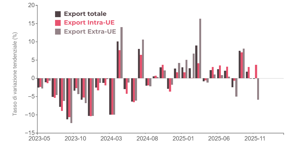 Le esportazioni verso i Paesi europei registrano una crescita del +4,2%, evidenziando il ruolo centrale dell’Europa nelle strategie di internazionalizzazione.